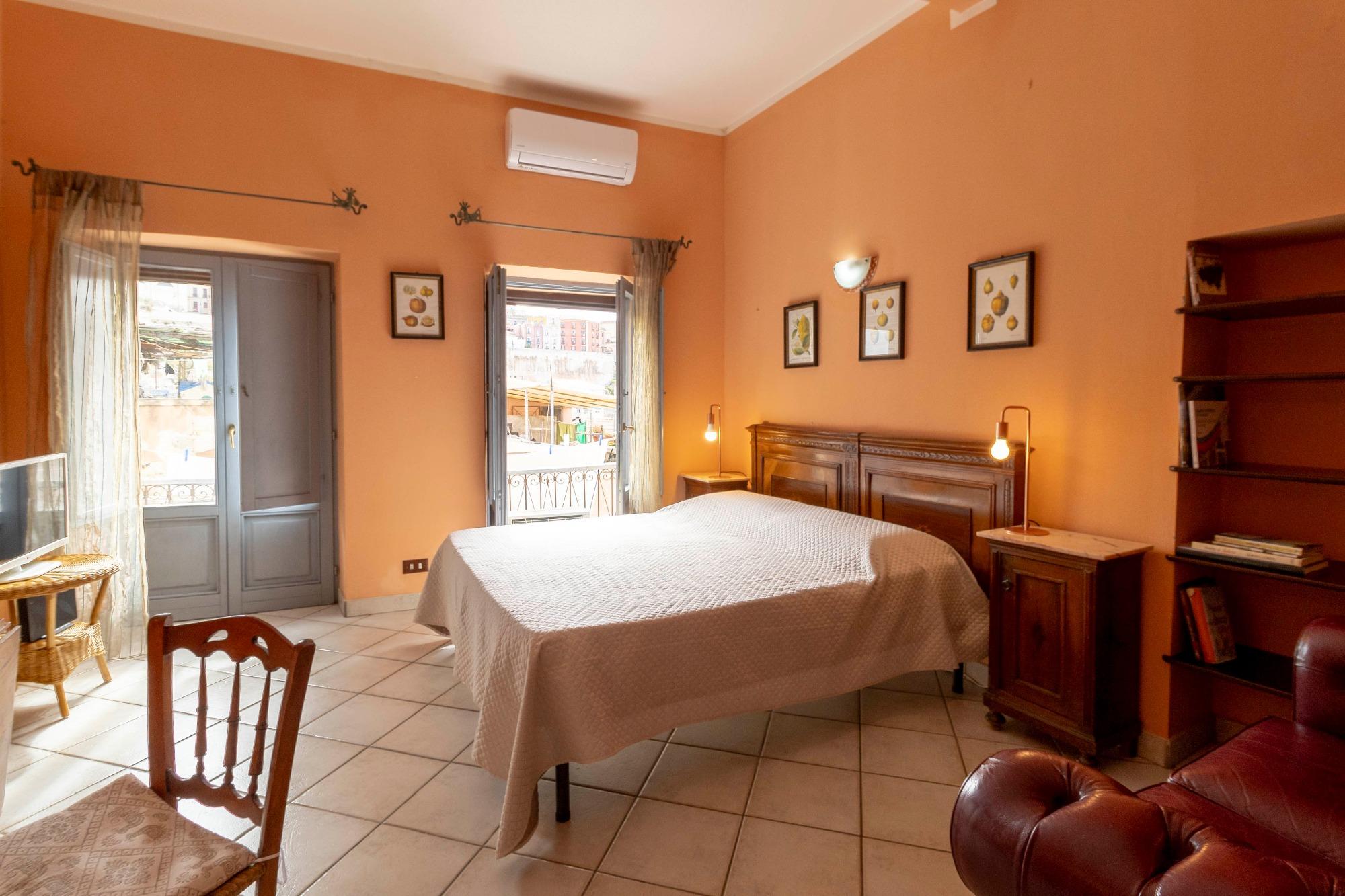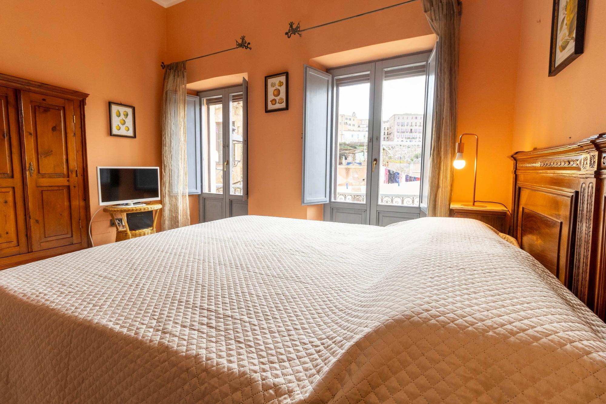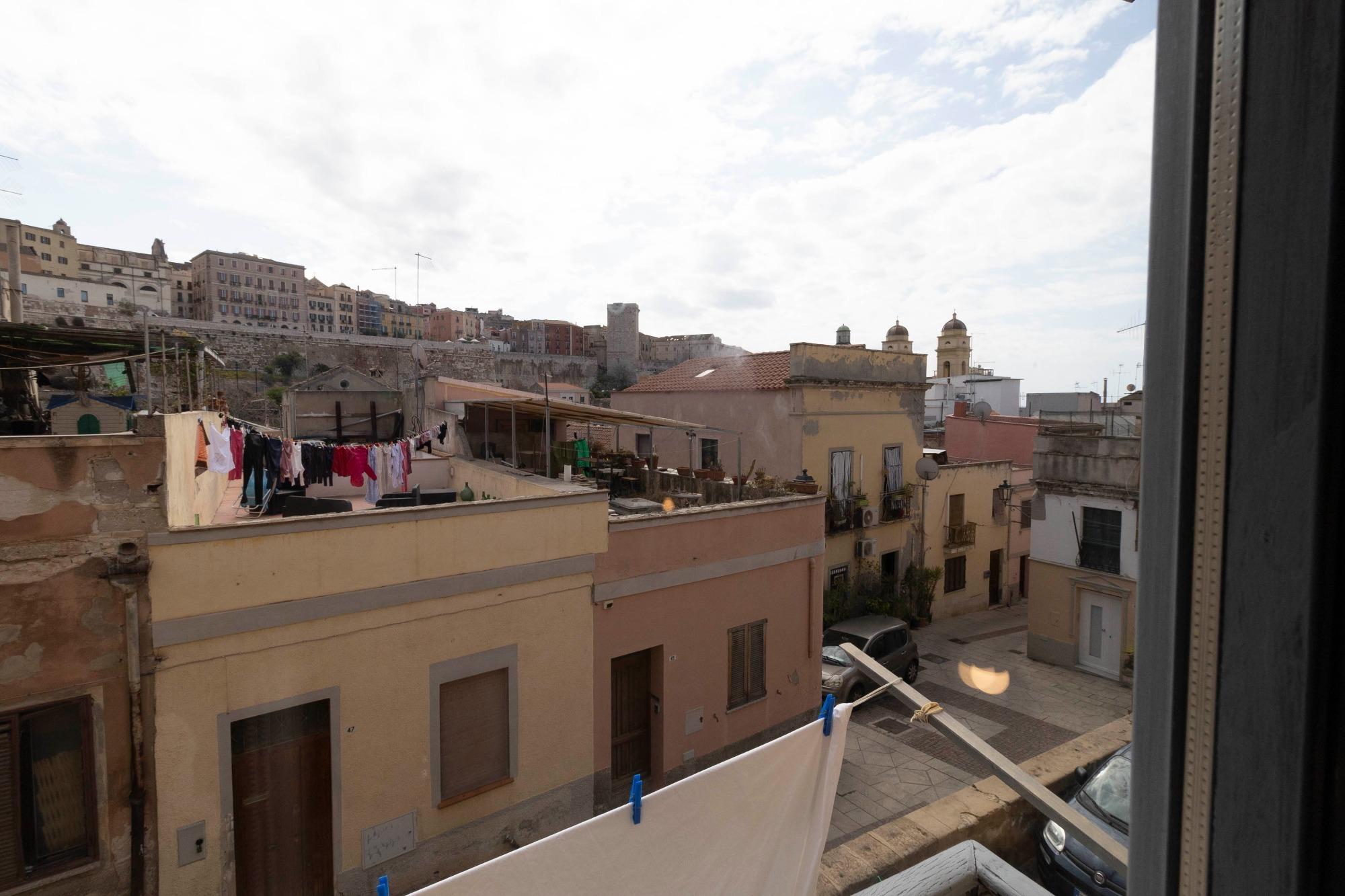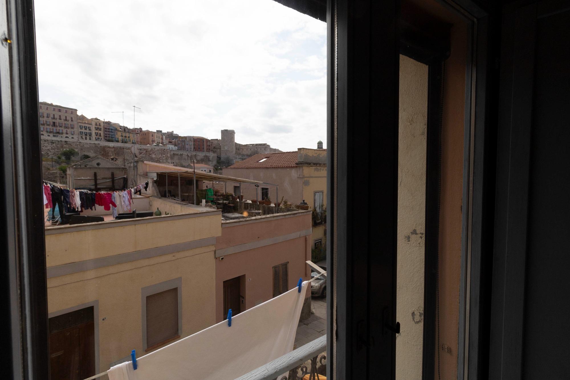 L’alloggio è ideale per una persona sola o per una coppia, anche con un bambino. Gli spazi, raccolti ma ben organizzati, comprendono una camera da letto panoramica, un bagno privato con box doccia e una zona giorno con angolo cottura attrezzato. L’appartamento è termocondizionato, dotato di Wi-Fi gratuito, TV a schermo piatto, lenzuola e asciugamani. Su richiesta è possibile aggiungere una culla o un letto singolo. I due balconcini regalano una piacevole vista sui tetti della città e sul quartiere di Castello, che si raggiunge con una breve passeggiata, e permettono di scorgere anche il mare di Cagliari.